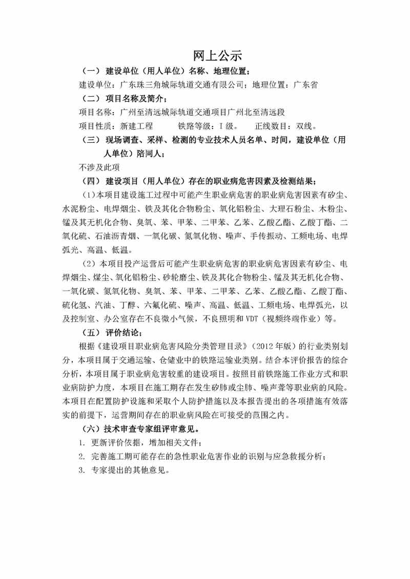 广州至清远城际轨道交通项目广州北至清远段职业病危害预评价