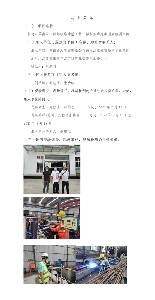 新建江苏南沿江城际铁路站前工程1标职业病危害因素检测评价
