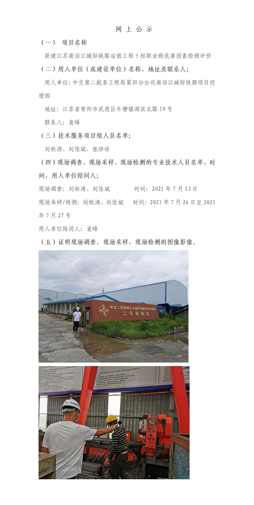 新建江苏南沿江城际铁路站前工程5标职业病危害因素检测评价