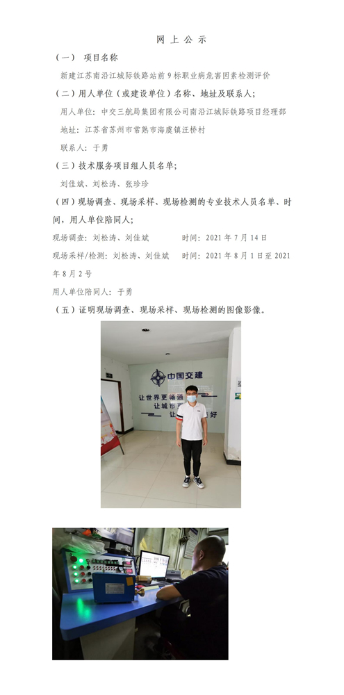 新建江苏南沿江城际铁路站前工程9标职业病危害因素检测评价