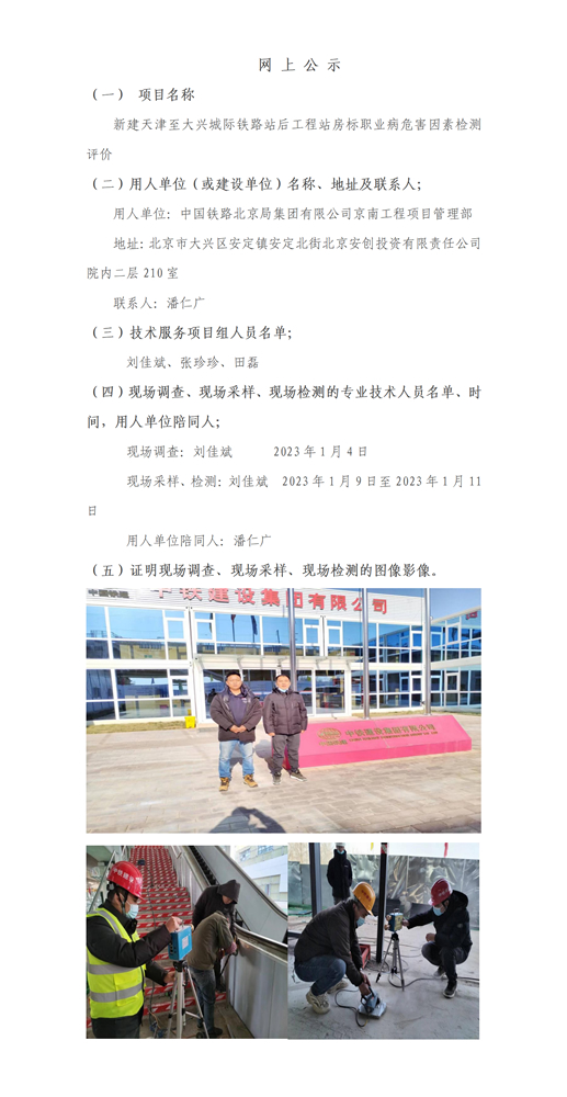 新建天津至大兴城际铁路站后工程站房标职业病危害因素检测评价