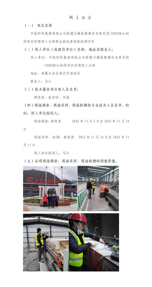 中铁四局集团有限公司新建川藏铁路雅安至林芝段CZXZZQ-6标段项目经理部三分部职业病危害因素检测评价