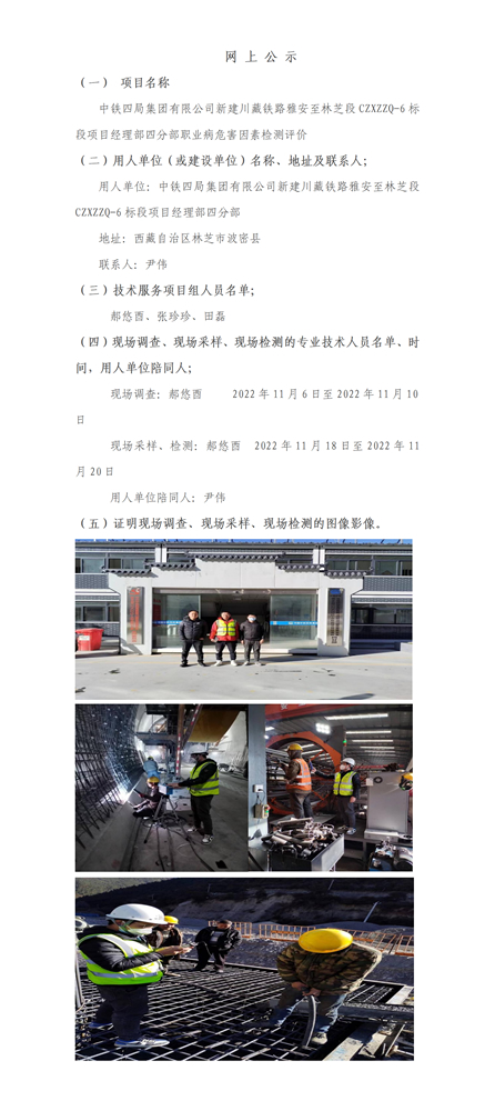 中铁四局集团有限公司新建川藏铁路雅安至林芝段CZXZZQ-6标段项目经理部四分部职业病危害因素检测评价