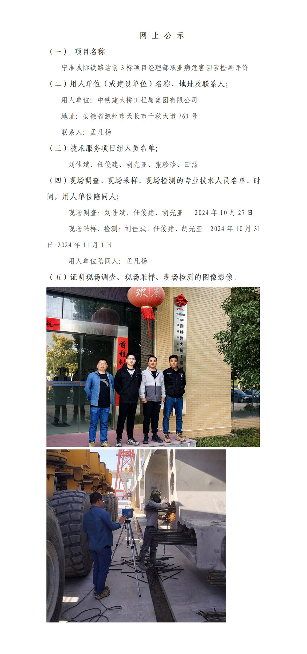 宁淮城际铁路站前3标项目经理部职业病危害因素检测评价