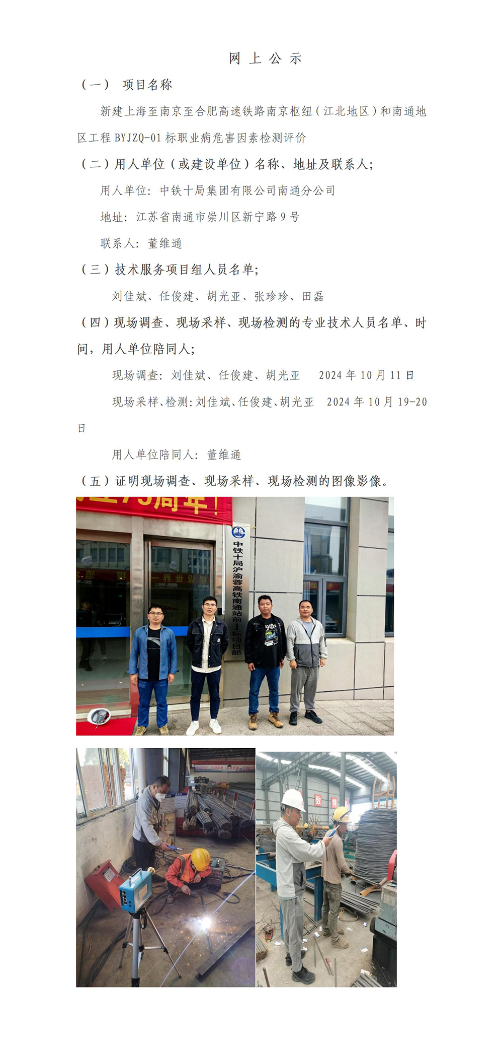 新建上海至南京至合肥高速铁路南京枢纽(江北地区)和南通地区工程BYJZQ-01标职业病危害因素检测评价