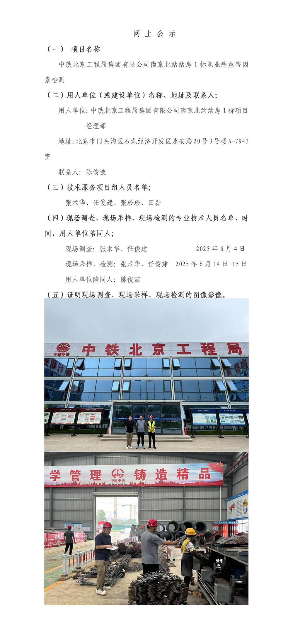 中铁北京工程局集团有限公司南京北站站房1标职业病危害因素检测