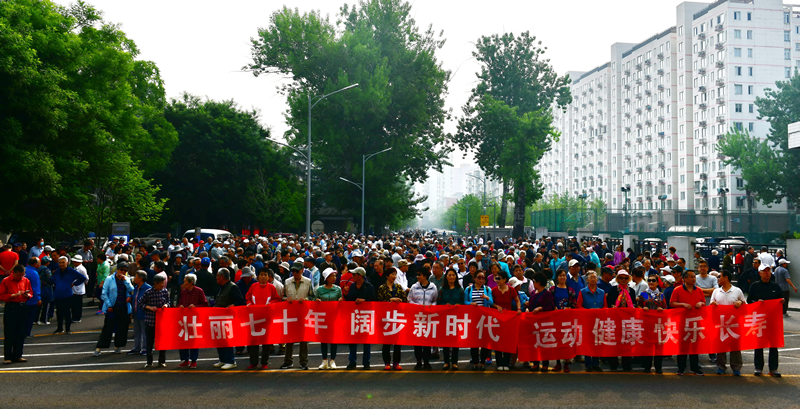 5月11日,晴空万里。上午八时许,位于北京市海淀区的中国铁道科学研究院集团有限公司文化宫广场,乐曲悠扬,《壮丽七十年、阔步新时代》《运动、健康、快乐、长寿》的红色横幅,显得十分夺目。1300多名集团公司离退休职工一大早从四面八方的家中陆续汇集于此,参加一年一度的离退休老同志健身走活动。