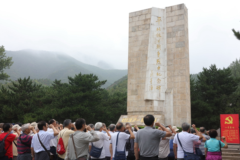 伴随着细细的小雨,在高高的平北抗日纪念碑前,党员们在党工委书记牛艳芳的带领下,面对党旗庄严地重温入党誓词,铭记入党誓言。