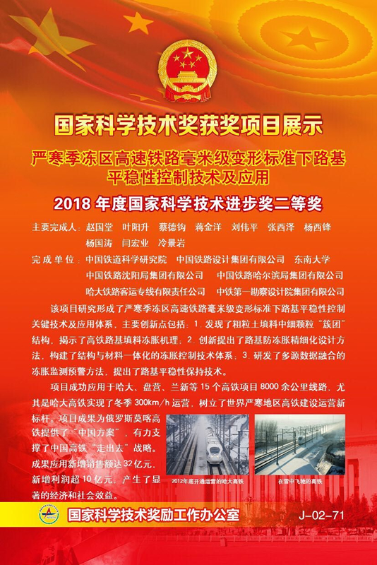 铁科院集团公司主持的“严寒季冻区高速铁路毫米级变形标准下路基平稳性控制技术及应用”,参与的“高速铁路弓网系统运营安全保障成套技术与装备”两个项目荣获2018年度国家科学技术进步奖二等奖。