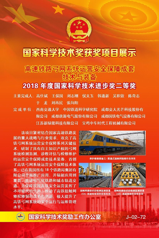 高速铁路弓网系统运营安全保障成套技术与装备 | 高仕斌,王保国,刘志刚,侯文玉,韩通新,吴积钦,陈奇志,于龙,刘再民,张向阳 | 西南交通大学,铁科院集团公司,成都交大光芒科技股份有限公司,成都唐源电气股份有限公司,成都国铁电气设备有限公司,江苏新绿能科技有限公司,宝鸡中车时代工程机械有限公司 |