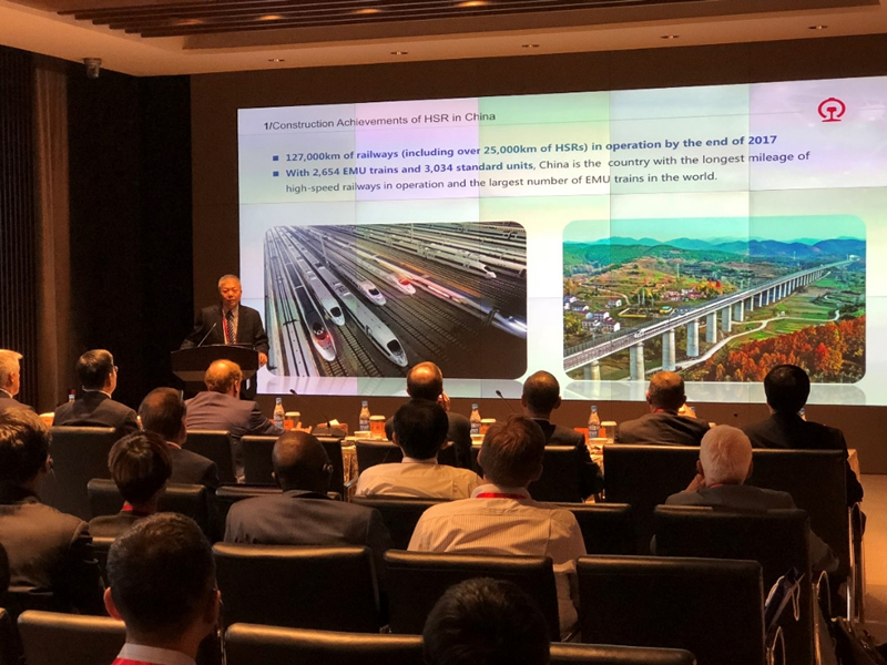 中国铁路总公司科技和信息化部主任赵国堂出席研讨会并致辞。他表示,经过不懈努力,中国高铁事业实现了历史性发展,取得了巨大成就,中国高铁总体技术水平进入世界先进行列,部分技术达到世界领先。中国铁路总公司坚持自主创新,系统掌握了不同气候环境、不同地质条件下建造高铁的成套技术,建设了高寒和热带高铁、沿海水网地区和沙漠风区高铁、西部山区和高原高铁。