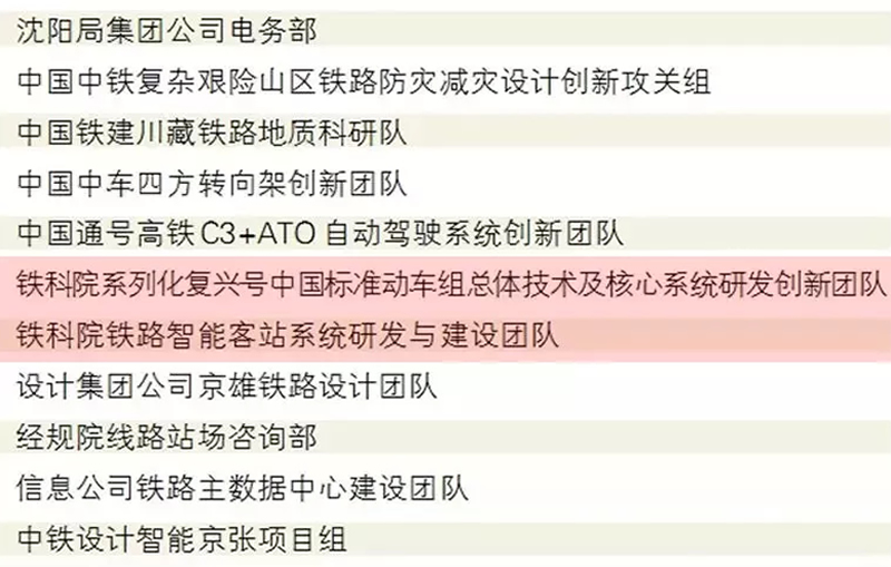 铁科院集团公司“系列化复兴号中国标准动车组总体技术及核心系统研发创新团队、铁路智能客站系统研发与建设团队”两个集体及“潘永杰、朱广劼、余俊、焦标强”四名个人分别荣获火车头奖杯、奖章。