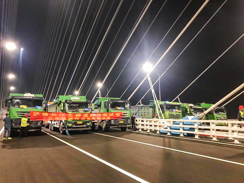 成桥荷载试验由中国铁道科学研究院集团有限公司所属北京铁科工程检测有限公司、中铁大桥勘测设计院集团有限公司所属中铁桥隧技术有限公司组成联合体共同承担。铁科院集团公司为联合体牵头单位,负责主航道桥动载试验、专用航道桥的静动载试验;大桥院为联合体成员单位,负责主航道桥静载试验。