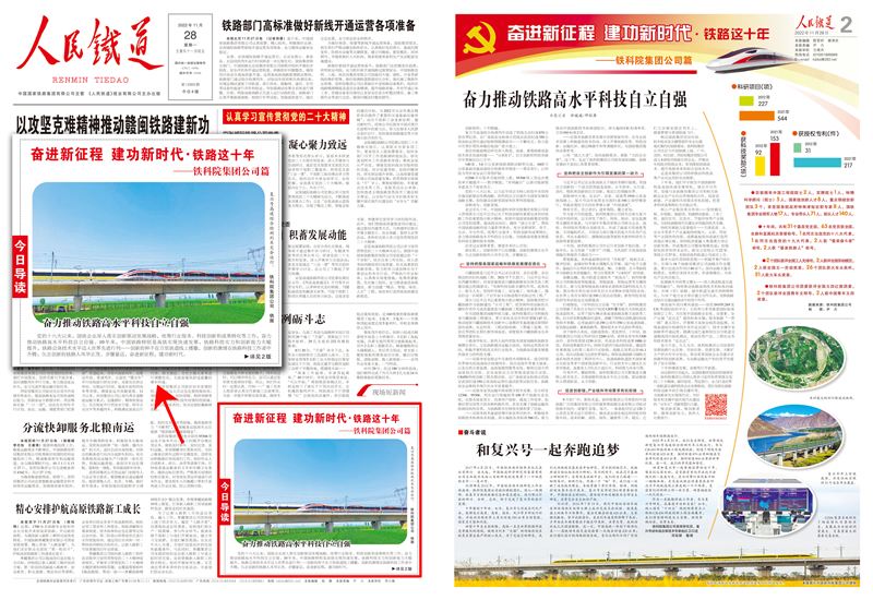 新时代十年,中国铁路科技创新成就辉煌,铁科院作为中国铁路战略科技力量,全面参与,笃真求卓,在铁路高质量发展中贡献了重要的铁科力量。2022年在新华社《自主创新炼成中国高铁名片》,央广《铁路这十年:由“中国制造”到“中国智造”让世界看到中国力量》《铁路这十年:“客运提质”助力百姓出行更美好》,人民铁道《奋进新征程 建功新时代·铁路这十年——铁科院集团公司篇》等系列报道中,从科技创新的视角积极展现铁路十年科技创新成就,深情记录铁科人迎难而上、勇攀高峰的坚实足迹。