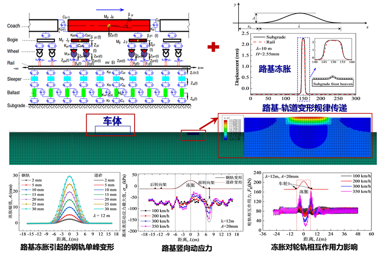 (2)构建了高铁路基冻胀-轨道结构耦合振动分析模型,考虑列车-轨道结构-冻胀路基多层结构,实现了路基不同不均匀冻胀变形输入,阐明了路基冻胀变形传递映射规律,获取了不均匀冻胀影响下车辆-轨道-路基体系动力响应特征,并探寻了冻胀幅值、波长、波距以及列车运行速度等因素的影响,揭示了季冻区高铁路基冻胀-轨道结构相互作用规律。