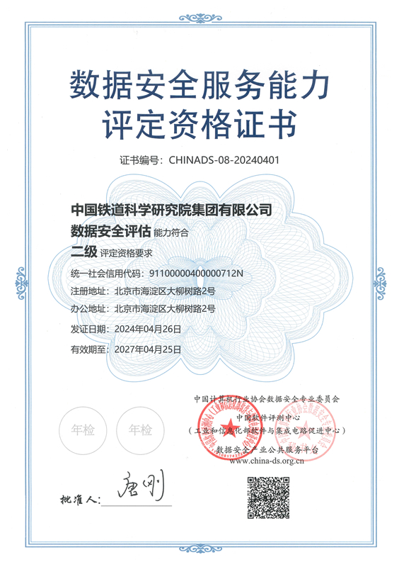 铁科院集团公司获得数据安全服务能力评定资格证书