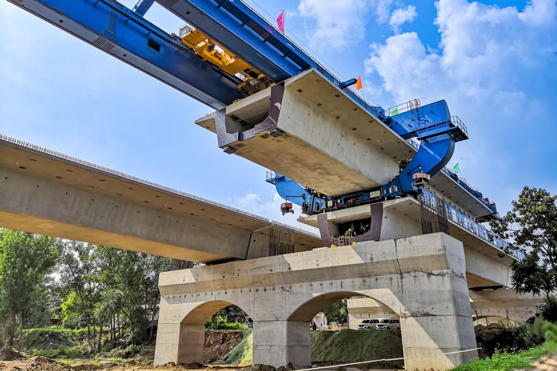 为进一步提升桥梁跨越能力及动车组消振性能,深入推进高速铁路40米简支箱梁成套建造技术研究。构建中国高铁新时代标准梁式桥系列化工程建设通用参考图和技术标准体系,首次研制兼容跨度20~40米箱梁、载重1000吨的智能化“搬梁—提梁—运梁—架梁”成套装备。2024年11月17日,成套建造技术装备在成渝中线完成首次千吨级箱梁架设,以及在北沿江、宁淮等多条铁路开展应用。