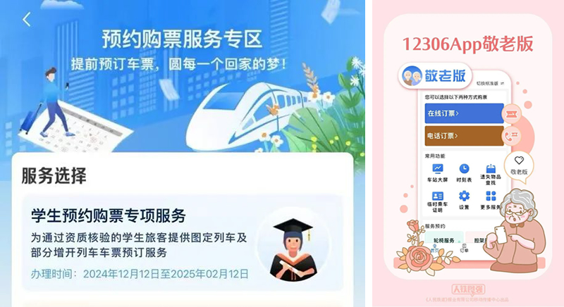 践行“人民铁路为人民”服务宗旨,全力落实12306用户体验提升专项工作部署,持续上新便民利民惠民措施,以“售票之变”温暖亿万旅客出行。上线铁路客运电子发票服务,旅客获取报销凭证更加便利。陆续推出和优化购票需求预填、起售提醒订阅、候补购票、同车接续等功能,为学生和务工人员开设预约购票专区服务,优化调整学生优惠票发售和查验规则,持续改版升级“敬老版”功能,实现一键拨打电话客服等适老化功能,拓展静音车厢服务范围,优化轮椅等重点旅客预约服务,优化港澳台和外国旅客验证和支付功能,不断回应旅客出行新期待。