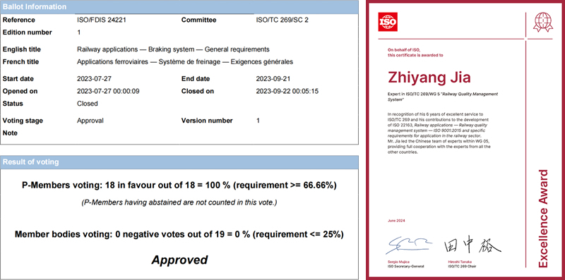 由铁科院集团公司主持制定的《铁路应用制动系统通用要求》(ISO24221:2024)国际标准正式发布,这是我国主持制定的机车车辆制动领域首项ISO国际标准。标准所技术专家联合中方团队与各国专家合作,完成ISO标准“铁路质量管理体系”,为ISO国际标准化活动积极贡献力量,荣获2024年“ISO卓越贡献奖”。