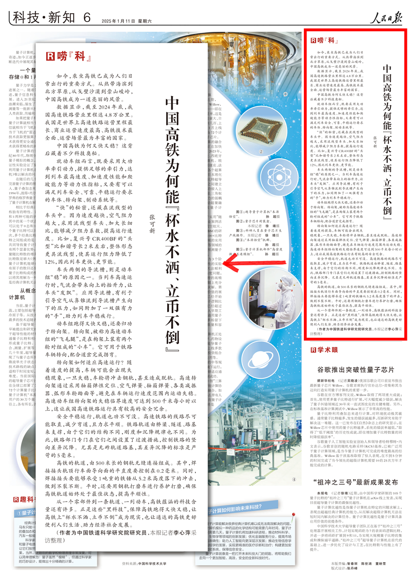 1月11日,《人民日报》刊发铁科院集团公司研发中心张可新研究员撰写的科普文章,揭示“中国高铁‘杯水不洒、立币不倒’”的科技奥秘。