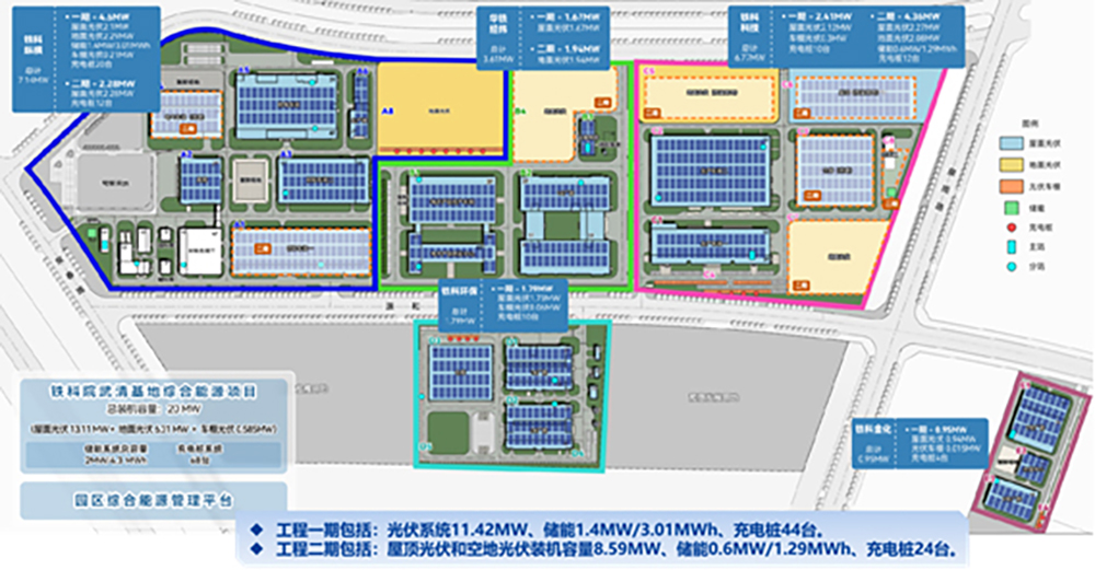 该项目是贯彻落实国家“双碳”政策及国铁集团关于国家铁路碳达峰行动的工作部署,由铁科院集团公司新能源公司投资、咨询公司负责实施开展的铁科院武清基地光储充一体化绿色低碳园区示范项目。规划建设光伏装机容量20MW、储能2MW、充电桩68台、大园区一体化综合能源管理平台,项目总体建设投资8056万。