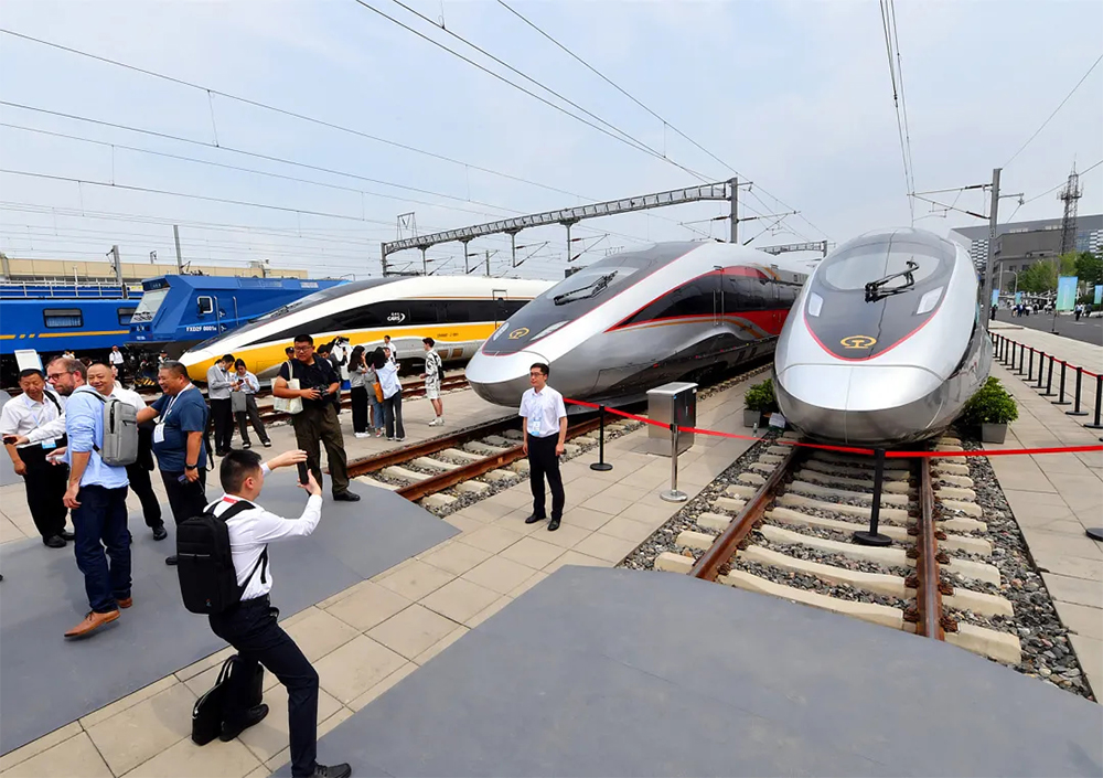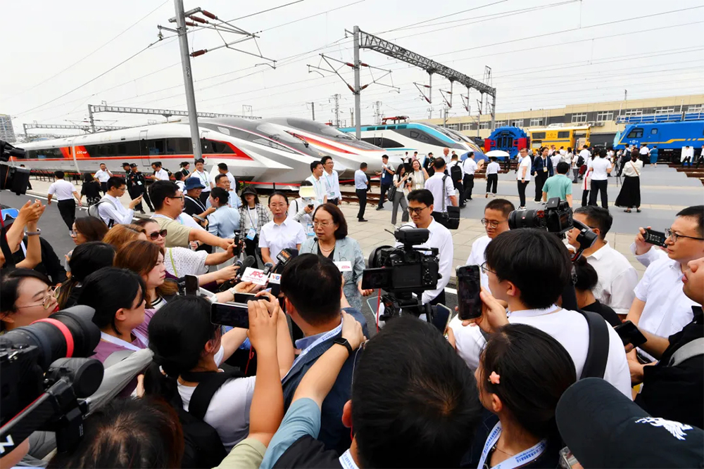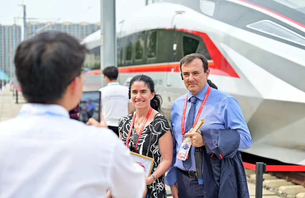 “复兴号有着不同编组和速度等级,能适应中国西部强风沙、东北严寒、东部高湿等各种极端环境。”铁科院集团公司首席研究员赵红卫向围拢的中外记者解释道。高温下,许多参观者放下了遮阳伞,只为与这些“钢铁巨龙”合影。