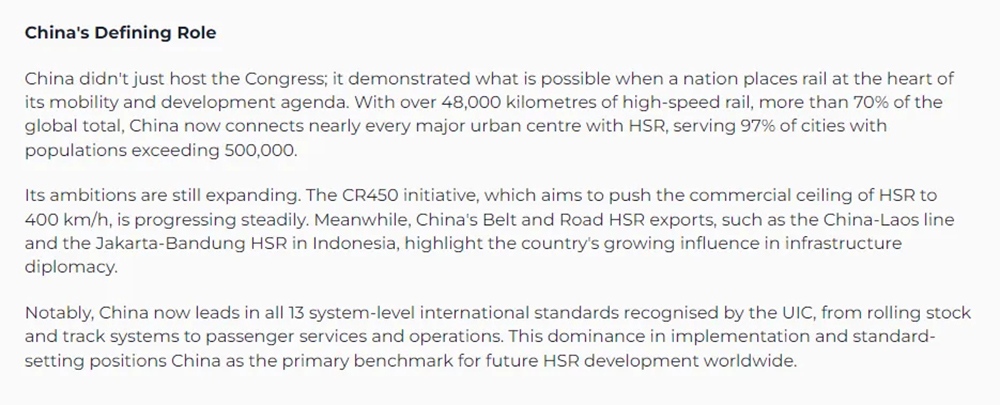 中国不仅成功主办了本届大会,更充分展示了将铁路建设置于国家交通运输和发展战略核心的制度优势。截至目前,中国高速铁路运营里程已超过4.8万公里,占全球总里程的70%以上,基本实现主要城市间高速铁路互联互通,覆盖了97%人口超过50万的城市。