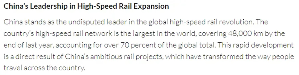 中国无疑是全球高速铁路发展的领导者。截至去年底,全国高铁运营总里程已达4.8万公里,占全球总量70%以上,规模稳居世界首位。这一快速成就的取得,源于中国长期推进的大型铁路建设项目,极大改善了公众出行体验,推动了交通网络的深度融合与优化。