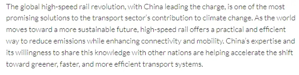 在中国引领下,全球高速铁路革命正蓬勃发展,成为交通领域应对气候变化最具前景的解决方案之一。随着全球迈向更加可持续的未来,高速铁路作为一种切实可行且高效的方式,不仅有助于减少碳排放,还能提升交通连通性与流动性。中国凭借丰富的高铁建设经验,积极推动国际合作,正加速推动全球向更加绿色、高效、智能的交通体系转型。