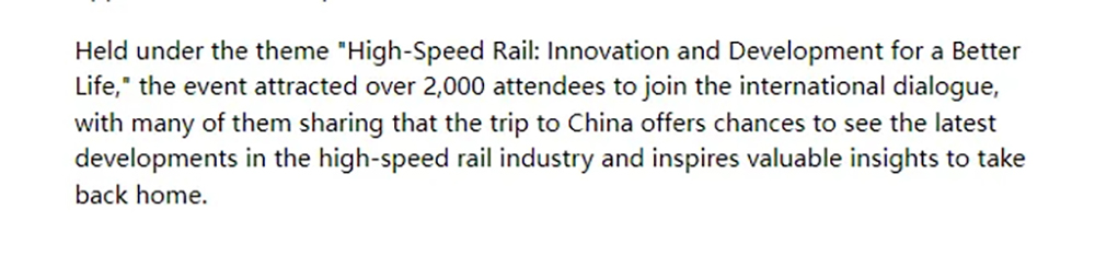 本次活动以“高速铁路:创新发展让生活更美好”为主题,吸引了2000多名与会者参与国际交流。许多参会者表示,此次中国之行不仅让他们亲眼见证了高速铁路行业的前沿成果,也带来了宝贵启发,并让他们将所见所学带回本国。