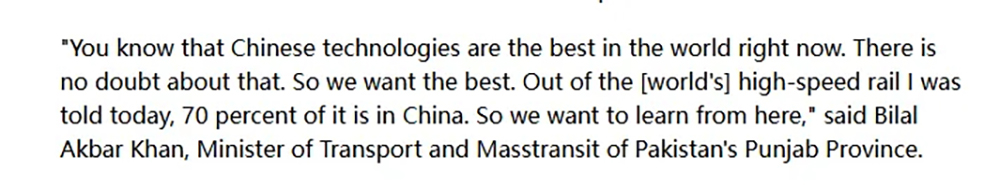 “大家都知道,中国的技术目前领先世界,这一点毋庸置疑。全球70%的高速铁路都在中国,我们想要最好的技术,所以我们希望向中国学习。”巴基斯坦旁遮普省交通及大众运输部部长比拉尔·阿克巴·汗表示。