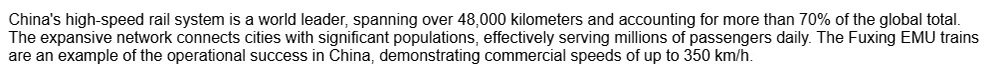 特别值得关注的是,中国在国际铁路联盟(UIC)认可的13项系统级国际标准中均处于领先地位,涵盖动车组制造、轨道系统建设、客运服务和运营管理等关键领域。凭借在标准制定与实践中的突出表现,中国已成为全球高速铁路未来发展的重要标杆。