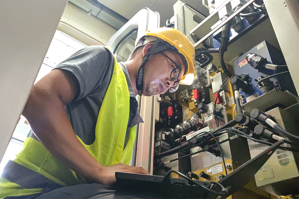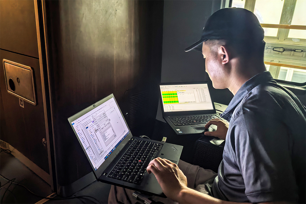 八月申城,上海虹桥动车所的检修库变身“科技战场”,纵横机电上海服务站开启“白夜交替”模式:白天在无空调车厢内进行复兴号动车组大版本软件升级,夜晚为动车组“把脉问诊”。工程师周金超同时操作两台笔记本电脑,在高温+密闭空间里“左右开弓”,汗水顺着安全帽带滴落。“每当在车站看到旅客登车的背影,就知道所有辛苦都值得。”他擦着额头汗水憨厚地说道。