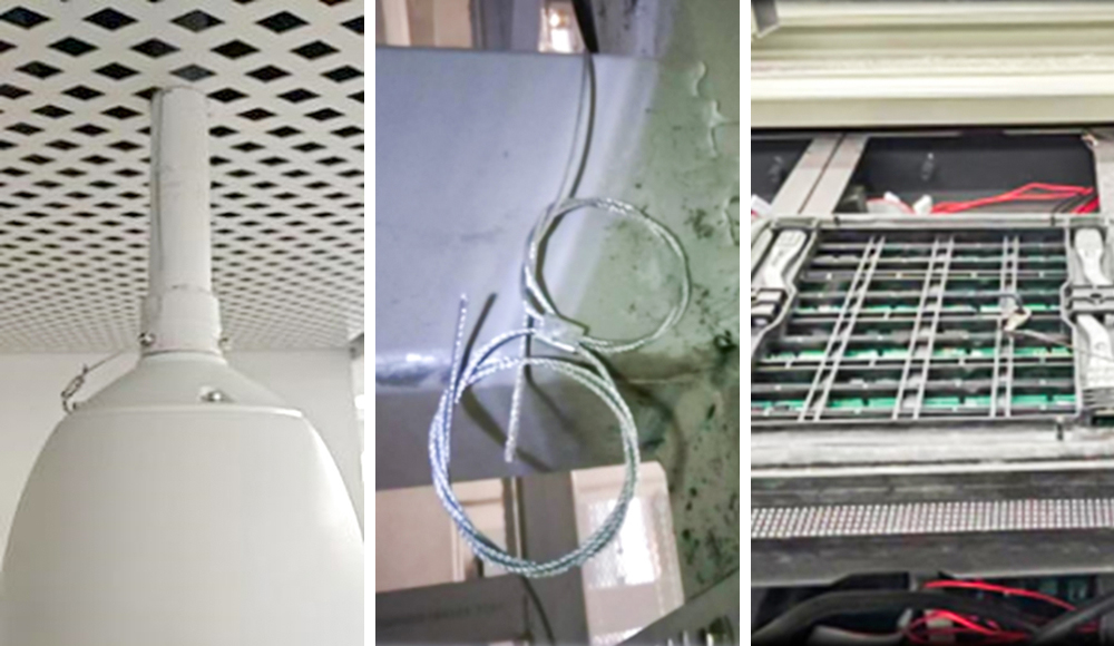 除BIM协同施工外,重庆东站项目还突破多项创新性工艺。针对大尺寸LED显示屏、扬声器、摄像机等悬挂设备,采用“物理插销+防坠钢丝绳”的双重固定方式——