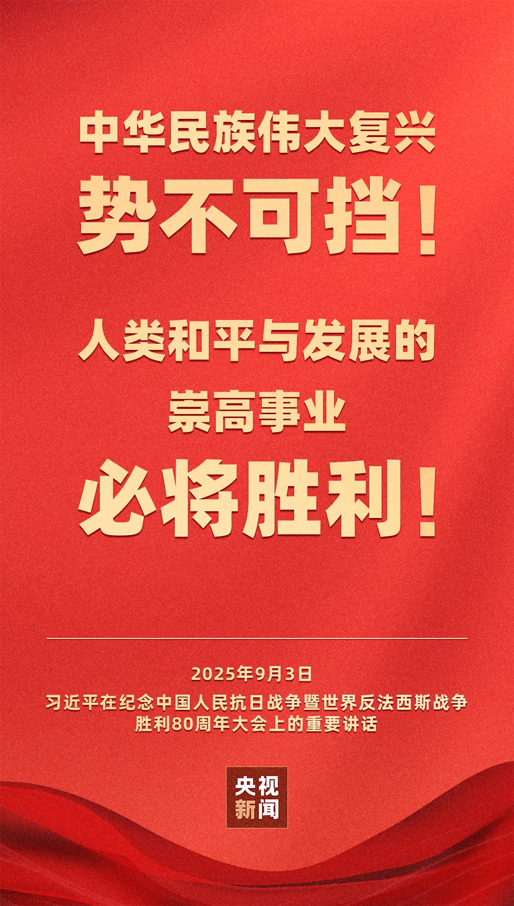 铭记伟大历史胜利,凝聚正义和平力量。9月3日上午,纪念中国人民抗日战争暨世界反法西斯战争胜利80周年大会在北京天安门广场隆重举行,以盛大阅兵仪式,同世界人民一道纪念这个伟大的日子,共同开创更加光明的未来。中共中央总书记、国家主席、中央军委主席习近平发表重要讲话并检阅受阅部队。