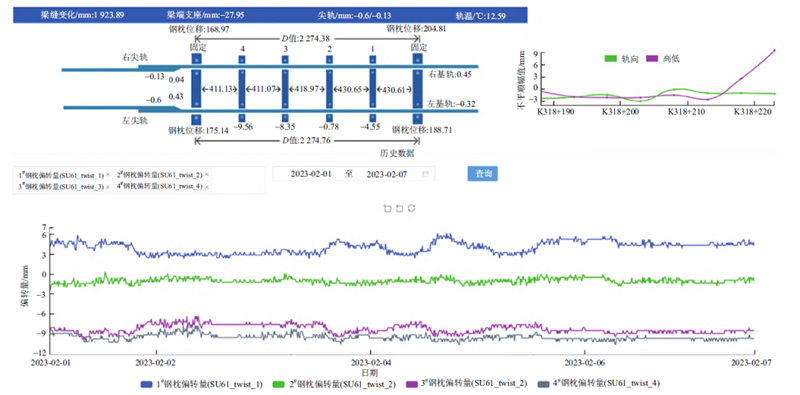 项目进展:目前,项目组以五峰山长江大桥、沪苏通长江公铁大桥为对象,开展了大跨度铁路桥梁梁-轨变形映射关系、线-桥平顺性调控方法与验收标准、梁端过渡区结构服役状态、线-桥检监测与维护关键技术的调研工作。掌握了大跨度桥梁主桥及端区域的轨道静、动态不平顺波形特征和变化规律;建立了大跨度悬索桥梁-轨结构建模方法与非均匀日照模拟方法,掌握了钢轨纵向力、梁-轨相对位移特征及非均匀温度场对梁-轨线形的影响;提出了一种基于Matlab和Midas软件的大跨桥上有砟轨道线-桥垂向变位映射关系分析方法,提高了线-桥垂向变位映射关系求解效率;建立了有砟道床-轨枕离散元耦合模型,掌握了温度荷载作用下道砟密实度变化规律、道砟颗粒接触力链特性;基于虚拟轨道巡检技术,提出了一种高速铁路行车动力特性评估方法;形成了基于组合弦的轨道精调方案优化方法;提出了大跨度桥梁上车体振动加速度简化分析方法,验证了该方法在大跨度桥梁上的适用性;基于深度学习算法建立了轨道不平顺与车体横向、垂向加速的关系,提出了利用轨道不平顺估计车体加速度的方法,形成了车辆响应与轨道高低不平顺的反演算法,可为千米级桥梁线-桥空间变形与车辆动态响应映射关系研究提供参考;提出了一种基于分布式光纤的刚体温度力监测技术,并开展了刚体温度力监测和钢轨不同部位的温度力测试试验;建立了大跨度桥梁线桥一体化检测监测系统技术方案,并在五峰山长江大桥上初步应用。