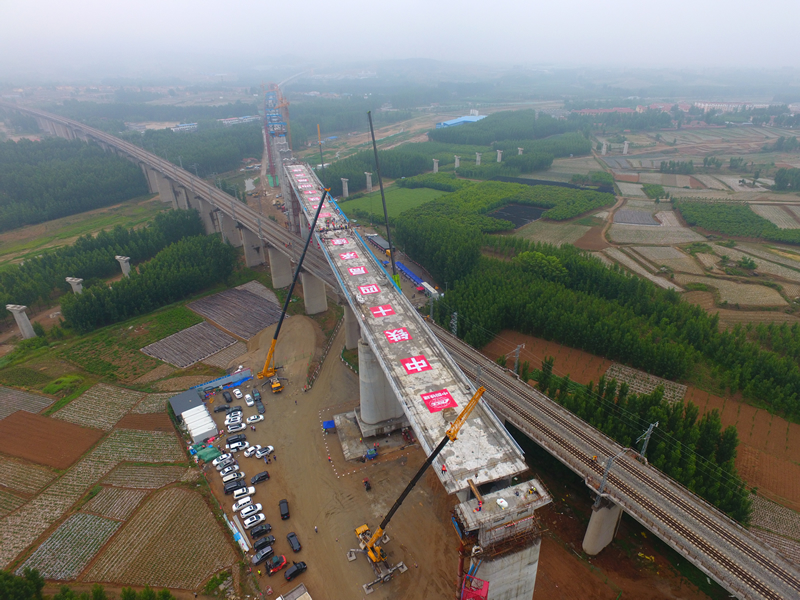 跨瓦日铁路特大桥位于山东省济南市莱芜区,桥梁全长3158.259m,全桥共89个墩台,平均墩高23.6m,是济莱高铁的重难点控制性工程。