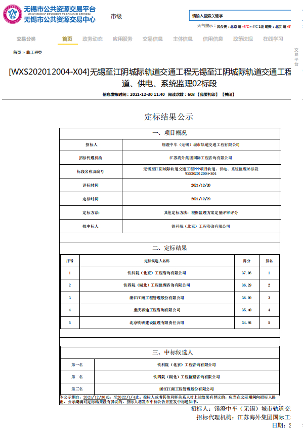 2021年12月30日,铁科院咨询公司机电业务部在无锡市参与的“无锡至江阴城际轨道交通工程PPP项目轨道、供电、系统监理02标段”项目投标中,一举中标。