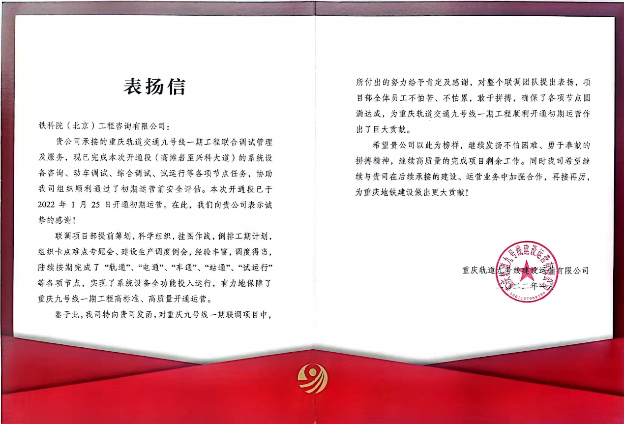 近日,铁科院咨询公司收到来自重庆轨道九号线建设运营有限公司发来的表扬信,公司工作给予了充分肯定。